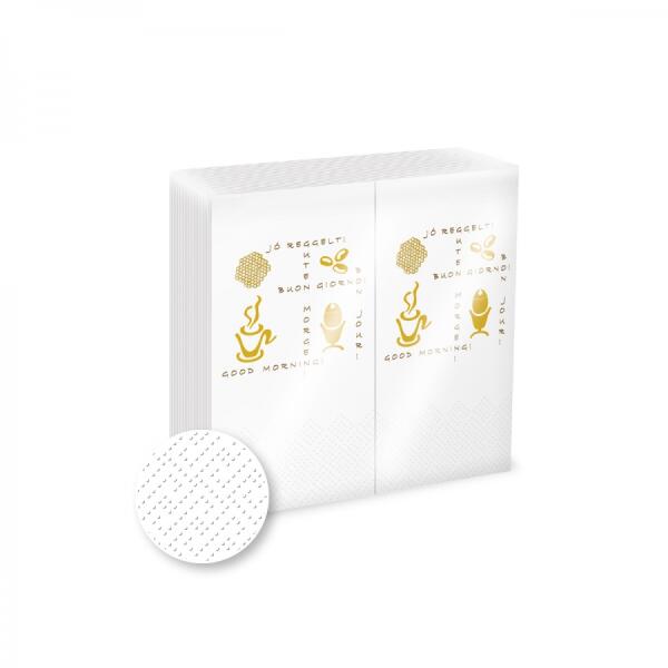 Fehér alapon "Jó reggelt" felirattal 2 rétegű 100% cellulóz 1/8 hajtott 80 lap/csomag 9 csomag/karton 56 karton/raklap GPSR: Lucart S. p. A.