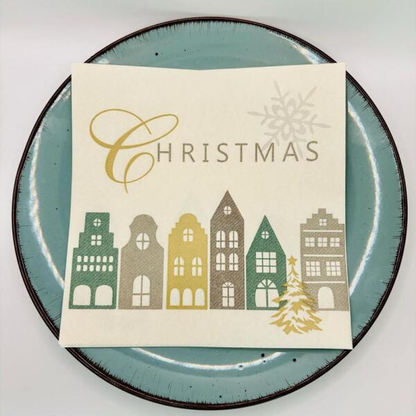 A Julika karácsonyi szalvéta igazi ünnepi különlegesség, amely meghittséget és modern eleganciát visz az asztalra. A szalvéta lágy bézs alapját színes városi házikók sora díszíti, melyek az adventi vásárok hangulatát idézik meg – egyszerre játékos és elegáns kiegészítője a terítésnek. Az aranyszínű karácsonyfa motívum és a finom „Christmas felirat azonnal ünnepi fényt kölcsönöz az asztalnak, így a Julika szalvéta tökéletes választás családi vacsorákhoz, éttermi rendezvényekhez vagy szállodai ünnepi terítésekhez . A szalvéta 40x40 cm-es mérete és textilhatású anyaga biztosítja, hogy könnyedén hajtogatható legyen különféle formákba – akár egyszerű, akár mutatós díszítésre vágyunk. A 50 darabos kiszerelés pedig gondoskodik róla, hogy kisebb és nagyobb ünnepi eseményekhez is elegendő legyen.