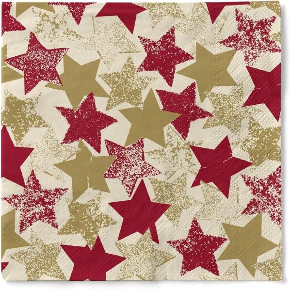 Csillogás és elegancia az ünnepi asztalon!  Készüljön fel a karácsonyi és szilveszteri ünnepekre ezzel a lenyűgöző 40x40 cm-es textilhatású szalvétával , amely krém alapon arany és bordó csillagokkal díszített! Ez a szalvéta nem csupán praktikus, hanem stílusos kiegészítője minden ünnepi étkezésnek, varázslatos hangulatot teremtve az asztalon. Miért válassza ezt a szalvétát?