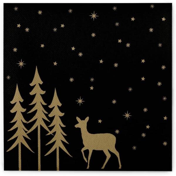 Luxus és elegancia a karácsonyi asztalon – fekete és arany Karácsonyi Szalvéta ! Az ünnepek közeledtével eljött az idő, hogy az asztalra is varázsoljunk egy kis fényt és eleganciát!Ezzel a textilhatású, 40x40 cm-es karácsonyi szalvétával a fekete és arany klasszikus párosa lenyűgöző kontrasztot hoz az ünnepi dekorációba. A szalvéta fekete alapja modern, kifinomult hátteret ad az aranyszínű fenyőfa és szarvas motívumoknak, amelyek finom csillogásukkal különleges, meleg ünnepi hangulatot teremtenek. Egy exkluzív karácsonyi vacsora, egy meghitt családi ebéd vagy akár egy elegáns szilveszteri fogadás alkalmával ez a szalvéta méltó módon díszíti az asztalt. Az aranyszínű minták elegáns ragyogása megragadja a tekintetet, és egyedi stílust kölcsönöz a környezetnek, anélkül hogy túlzásokba esne. Az anyag textilhatása pedig nemcsak prémium megjelenést biztosít, de kényelmes, puha tapintást is nyújt a vendégek számára. Teremts egyedi, meghitt ünnepi hangulatot a fekete és arany tökéletes eleganciájával, és tedd az ünnepi asztalt a legemlékezetesebb látványossággá!
